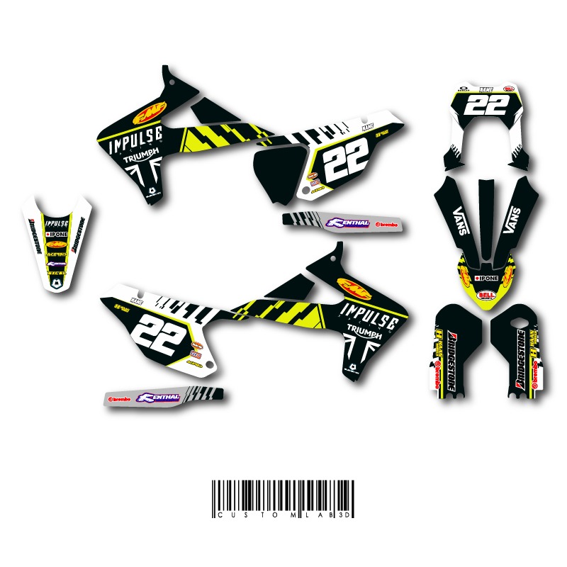 Le kit déco personnalisé pour motocross TRIUMPH 250 TF-E 2025-2026 contient : (Le contenu peut varier selon le modèle sélectionné)