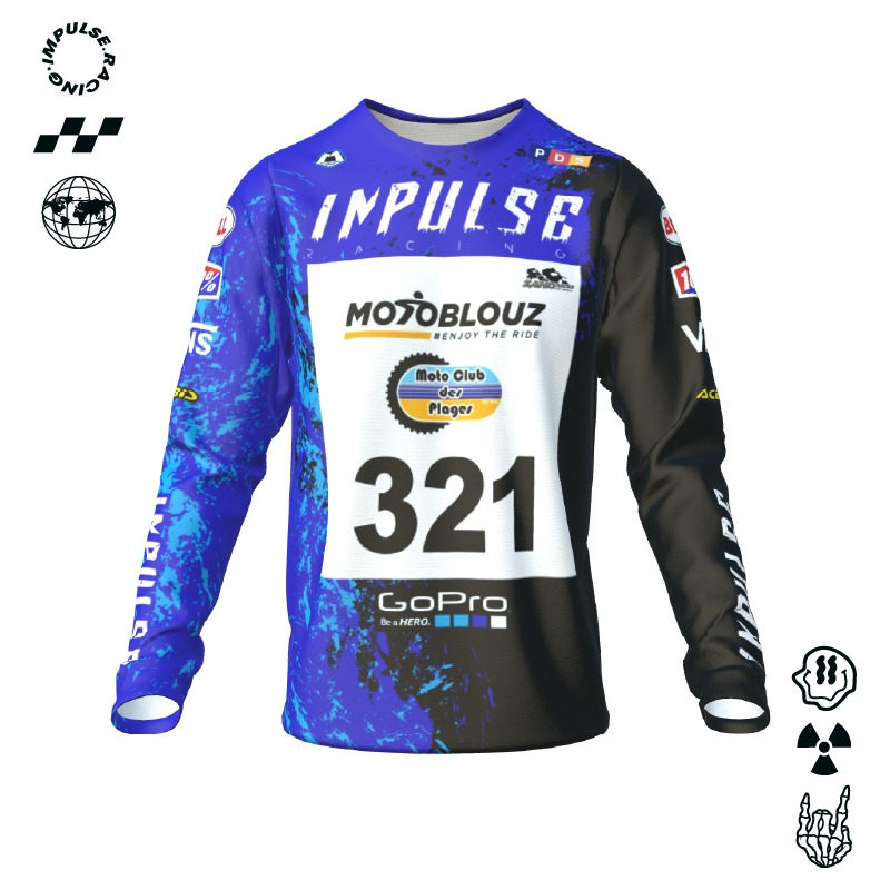 Découvrez ce maillot personnalisé de motocross Impulse Tech avec le dossard officiel de chaque épreuve du Championnat de France de course sur sable directement intégré lors de la fabrication dans nos ateliers en France. A l'aide de notre configurateur en ligne 3D, vous pouvez personnaliser ce maillot très facilement : choisissez la taille de votre maillot, changez les couleurs, ajoutez les logos de vos partenaires et ajoutez votre numéro sur le dossard officiel de votre course sur sable.