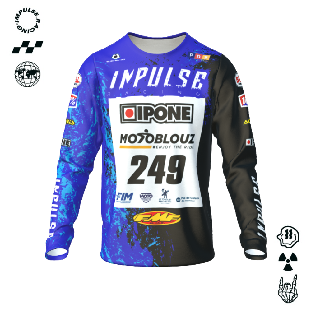 Découvrez ce maillot personnalisé de motocross Impulse Tech avec le dossard officiel de chaque épreuve du Championnat de France de course sur sable directement intégré lors de la fabrication dans nos ateliers en France. A l'aide de notre configurateur en ligne 3D, vous pouvez personnaliser ce maillot très facilement : choisissez la taille de votre maillot, changez les couleurs, ajoutez les logos de vos partenaires et ajoutez votre numéro sur le dossard officiel de votre course sur sable.